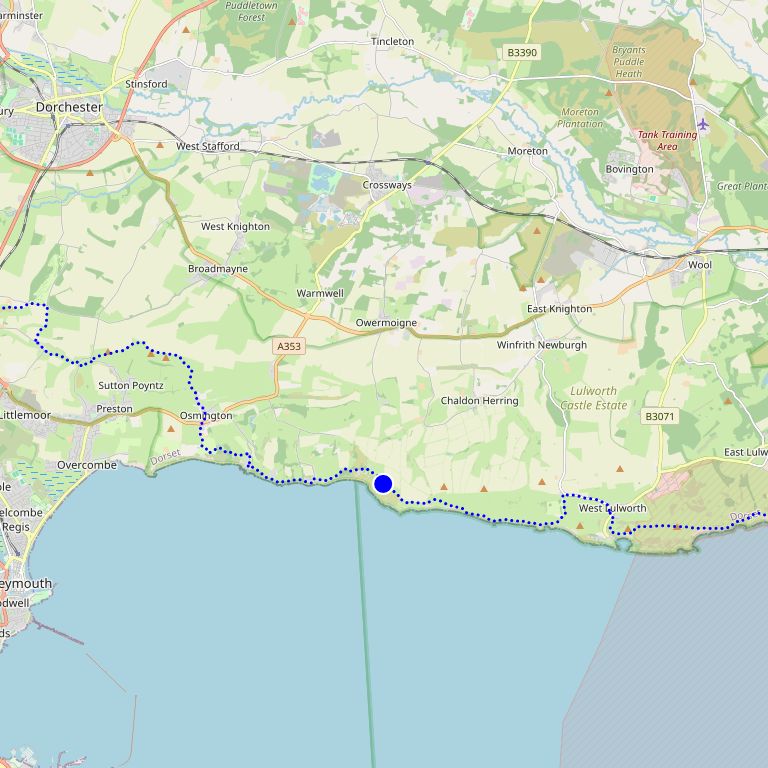 Up the top of the first big hill, on the plateau heading out towards White Nothe, which is the lumpy headland you can see in the distance.